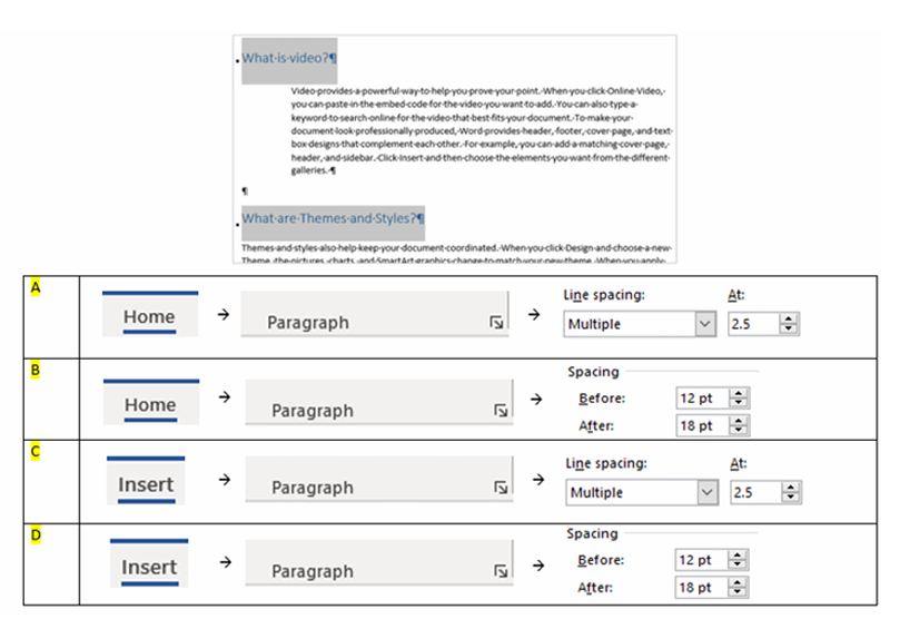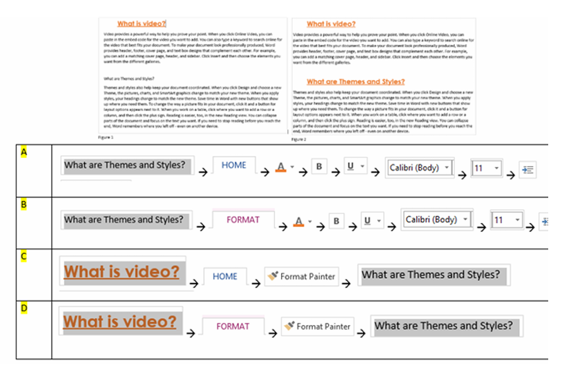 Q7. You would like the formatting of “”What is video?”” to be applied to the second title “”What are Themes and Styles?”” Which is the best method to achieve it?