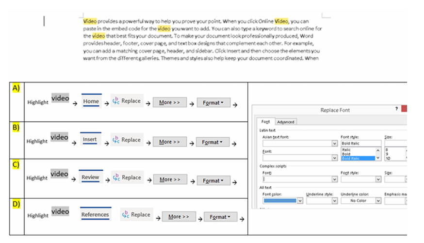 Q23. You would like to format the highlighted word “video” in the document below, to bold, italic and blue in color. Which is the fastest way to do this?