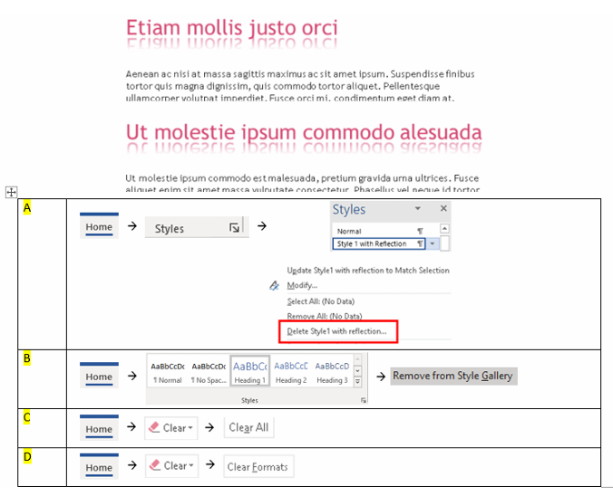 Q34. You have created two title headings in your document. How do you remove the formatting for these title headings?