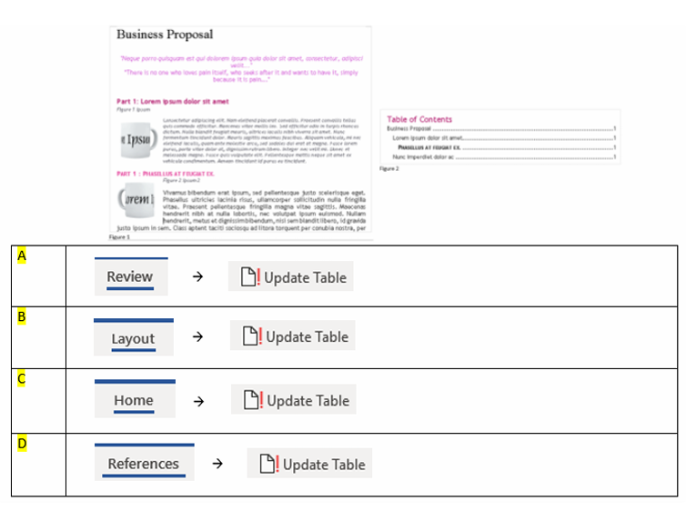 Q35. You have updated the titles in your business proposal as shown in Figure 1. You need the table of contents updated to reflect the changes as shown in Figure 2. How do you do this?
